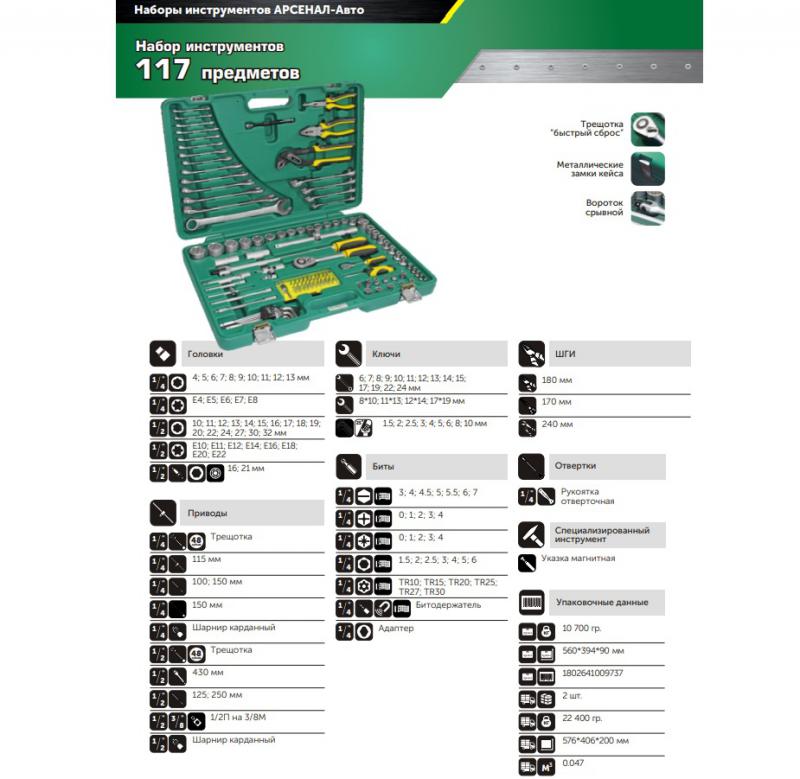 Набор инструментов 117 предметов AUTO Арсенал AA-C1412P117 подходит для тех, кому нужен большой выбор ключей и головок. В комплекте есть срывной вороток на 430 мм, а также ключи разрезные, набор бит в органайзере и большой подбор удлинителей. Сталь, из которой изготовлен инструмент, легирована хромом и ванадием с нанесением никелевого покрытия. Крепкий кейс из ударопрочной пластмассы. Наборы инструментов Арсенал имеют пожизненную гарантию. Инструмент Арсенал - Специально разработан для Российских условий!!!