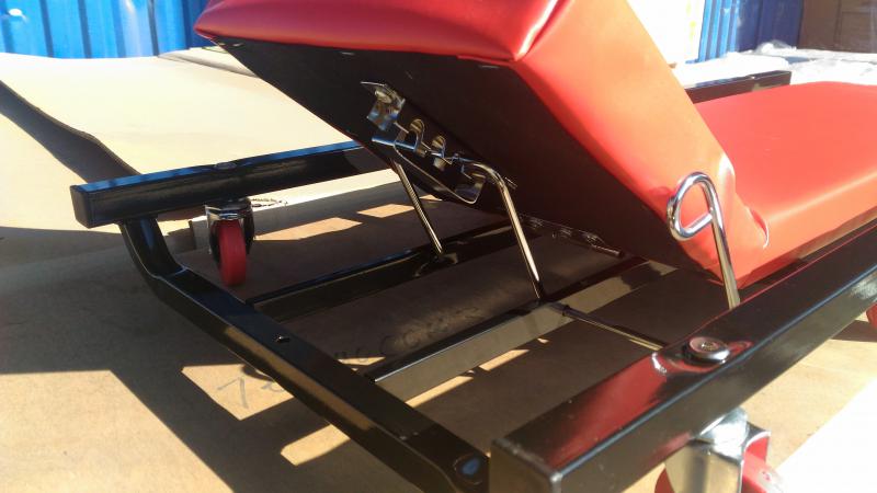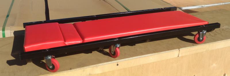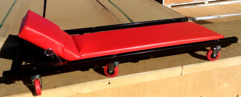 Лежак ремонтный на 6 колесах имеет металлическую основу, мягкий поролоновый матрац и поднимающийся подголовник. Обеспечивает удобство проведения ремонта трансмиссии, систем питания, выпускной системы и прочих работ. Лежак ремонтный на 6-ти колесах, поднимающийся подголовник