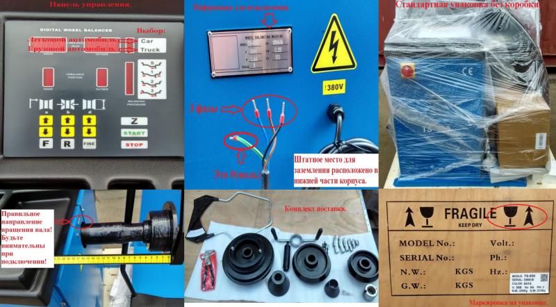 Уважаемые клиенты, при подключении станка к электрическим сетям просим учитывать что моторы у этого балансировочного станка трехфазные (четыре провода вместе с заземлением) просьба подключать оборудование только электрикам. После подключения просим проверить направление вращения электромоторов. Во избежание травм обязательно подключайте провод заземления балансировочного станка.