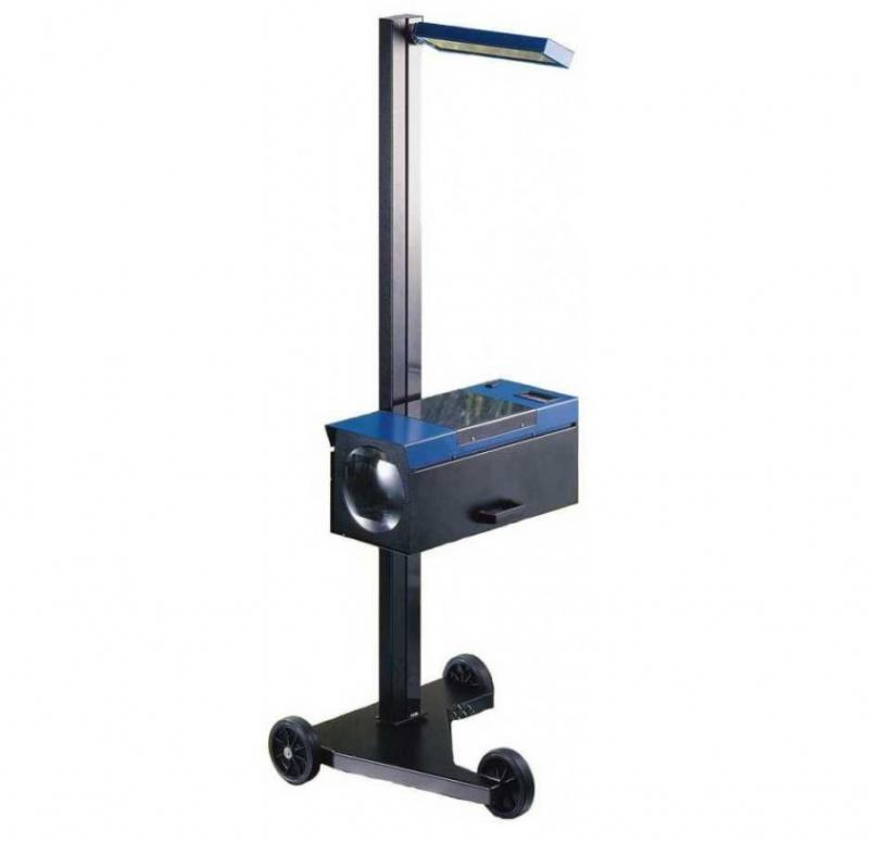 • Устанавливается на вертикальную мобильную стойку с тремя прорезиненными колесами; переднее колесо оснащено эксцентриком для регулировки положения прибора по отношению к горизонту