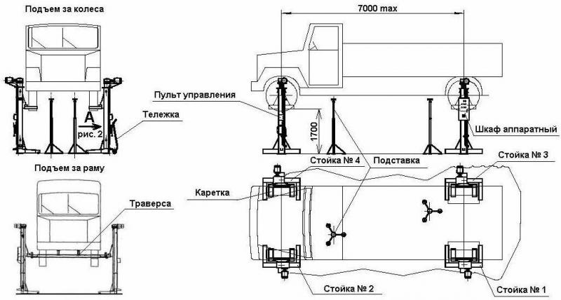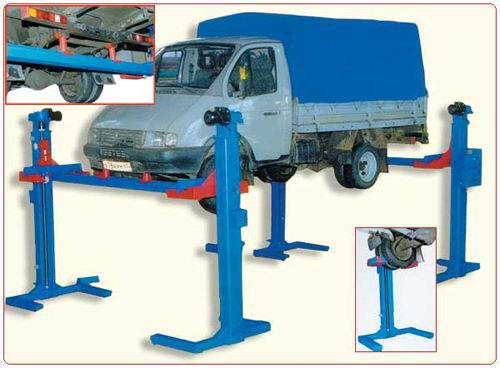 Комплектуется двумя траверсами для поднятия автомобилей за раму с двумя типами опорных подхватов и специальными накладками, закрепляемыми на лапах каретки. Накладки позволяют осуществлять подъем автомобилей с диаметрами дисков колёс от 12 до 15 или от 15 до 17 дюймов. Возможность быстрого освобождения занимаемой подъемником площади и установки его в любом месте. Устанавливается на полу с допускаемым удельным давлением на него более 10 кг/см2 .