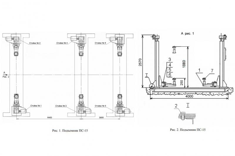 Подъемник состоит из шести стоек № 1, 2, 3, 4, 5, 6 (см. Рис.) и балок поворотных 1. Стойки № 1, 2, 3, 4, 5, 6 подъемника крепятся болтами 2 (см. выноску I на Рис.2) к раме, состоящей из трех оснований. Рама забетонирована в пол. Для установки поворотных балок на каретках стоек предназначены оси 3 и осей держатели 4, а также болты и шайбы 5 и 6 для крепления осей держателей. В состав подъемника входит комплект сменных частей 7 с подхватами и основаниями для подхватов, используемых при подъеме автобусов-сцепок. Стойка состоит из вертикальной колонны, привода подъема и каретки. На стойке № 1 установлен шкаф аппаратный. На стойках № 2, 3, 4, 5 и 6 посты управления. Колонна представляет собой сварную конструкцию. Привод подъема состоит из электродвигателя, червячного редуктора, соединительных муфт и винта. При вращении винта по нему перемещаются рабочая и страхующая гайки. На рабочую гайку через сферическую шайбу опирается каретка. На каретке закреплен упор (лыжа) для отключения перемещения каретки в крайних верхнем и нижнем положениях, воздействуя на конечные выключатели, закрепленные на колонне.