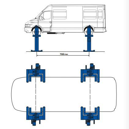 Данный подъёмник – четырехстоечный, электромеханический(пара винт/гайка), мобильный(подкатной). После использования подъемник можно откатить и освободить месть для других авто. Для грузовых автомобилей г/п 6т. Подхват за колеса автомобиля 310-600мм. Синхронизация кареток – кабелем между колоннами. Управление – с пульта 4 стойки одновременно или каждой в отдельности. Максимальное расстояние между осями автомобиля – 7500мм.