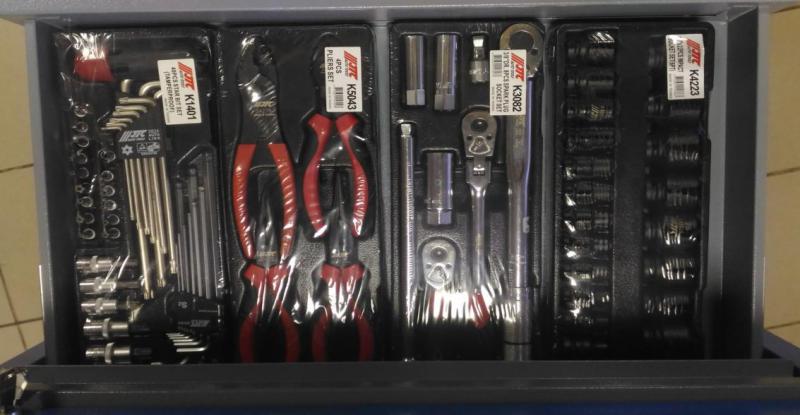 В данный комплект инструмента Профи входит тележка инструментальная с 6 ящиками, набор для удаления любого крепежа, накидные, комбинированные и рожковые ключи, набор шестигранников TOPX и бит, наборы головок и отверток, клещи, утконосы, щипцы и набор трещоток - все самое необходимое в этой тележке есть. Применяется при работе на дилерских СТО.