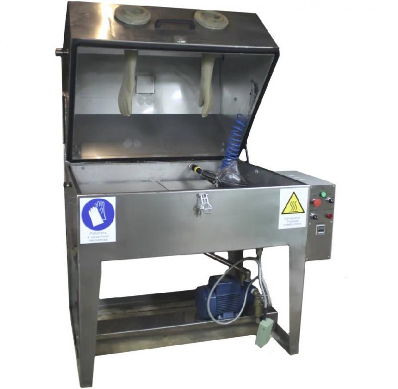 Рабочее пространство: 800x500x300 мм. Объем моющего бака 75л. Масса детали до 70 кг.  Итальянский насос! Сделано в России. Ручная мойка для деталей ТС800 РМ позволяет максимально качественно обработать поверхности со сложной геометрией, глухие отверстия и укомплектована надежным насосом, качественными фитингами, ТЭНами из нержавеющей стали, европейской электрикой. Корпус изделия выполнен из стали AISI430, толщиной 2,0 мм.