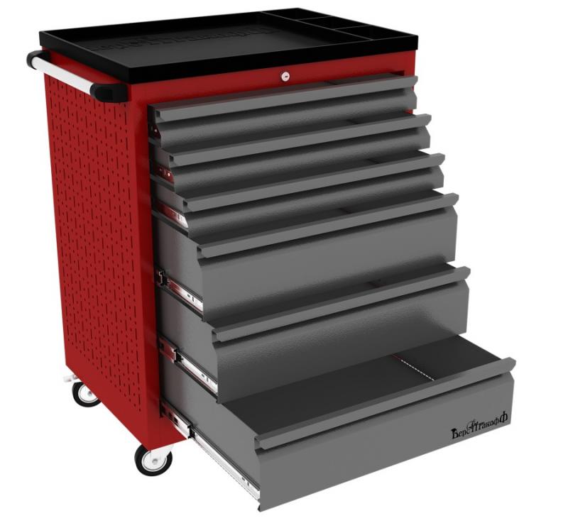 Тележки инструментальные серии PROFFI 950 предназначены для использования на предприятиях любого профиля занятых ремонтом и изготовлением различной продукции. На боковые стенки инструментальной тележки нанесена перфорация размером 25х25 мм и диаметром отверстия 8 мм, что позволяет устанавливать на них навесной инструмент или крючки. Наибольшей популярностью тележки инструментальные пользуются в сфере авторемонта и обслуживания автомобилей .Тележки имеют выдвижные ящики на шариковых телескопических направляющих полного выдвижения с фиксацией в закрытом положении, предотвращающее открывание при передвижении тележки. Ящики имеют центральный замок, который позволяет ограничить доступ посторонних лиц к содержимому ящиков. Тележка инструментальная изготовлена из высококачественного металла ведущих Российских производителей, покрашена порошковой краской производства Германии, имеет итальянскую и турецкую фурнитуру. Тележки для инструмента оснащены двумя не поворотными колесами диаметром 100 мм, одним поворотным и одним поворотным со стопором, которое фиксирует тележку и предотвращает непроизвольное скатывание.