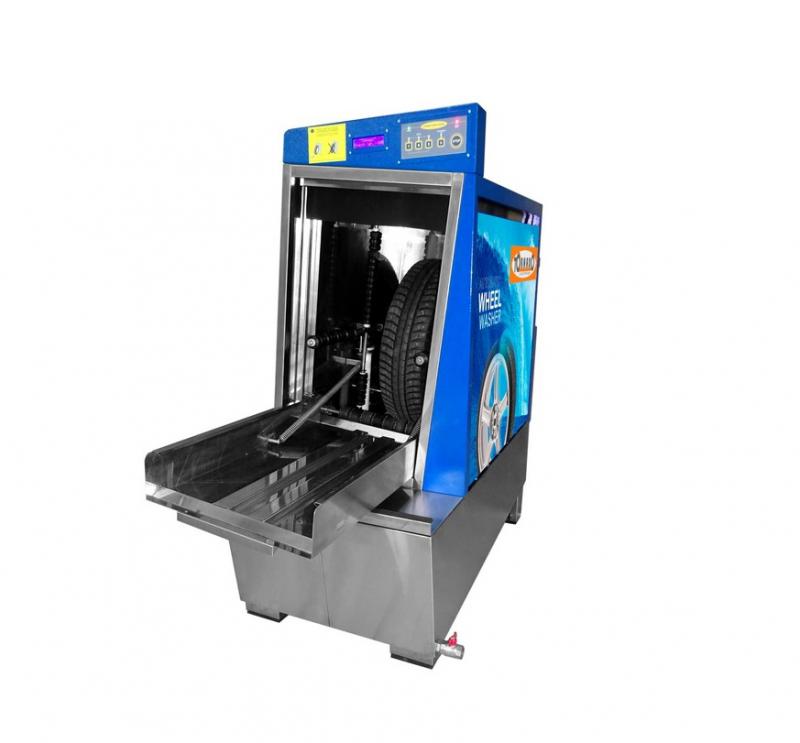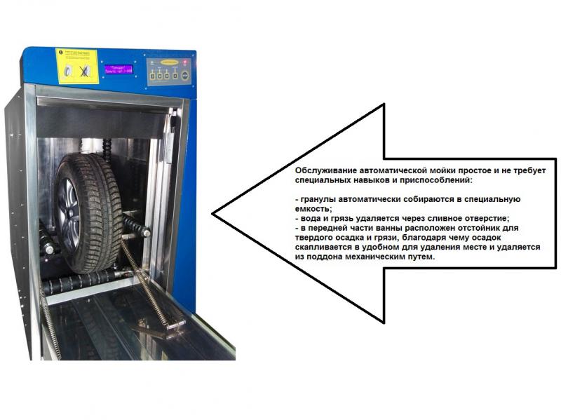 Мойка колес работает по замкнутому циклу (250-300 колес), благодаря чему для ее подключения нужны лишь сжатый воздух и электричество. Мойка не требует подключения к водопроводу и канализации. Метод мойки заключается в подаче воды под высоким давлением и пластмассовых гранул в качестве моющего элемента через распылительные сопла.Вертикальная стабилизации колеса достигается применением двух ведущих валов и конструктивных особенностей моечного отдела. Данная конструкция позволяет за 2-3 секунды выставить колесо в правильное положение и исключить возможность блокировки и порчи покрышки и диска.