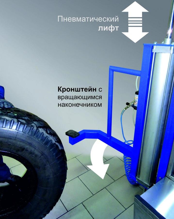 Операции загрузки и разгрузки колеса проводятся при помощи вмонтированного с левой стороны мойки пневматического лифта, оснащенного плечом с вращательным окончанием, позволяющим легко и безопасно захватывать, и поддерживать обод загружаемого или выгружаемого колеса.