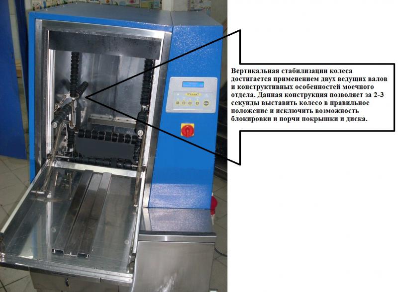 Основные отличия данной модели: система стабилизации колеса в вертикальном положении; полная шумоизоляция моечного отделения; стационарная рама гидрозатвора; защита внешней стороны диска от повреждений; два ведущих вала. Процесс мойки колес