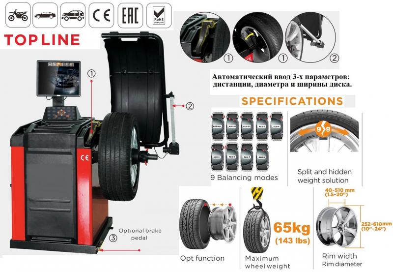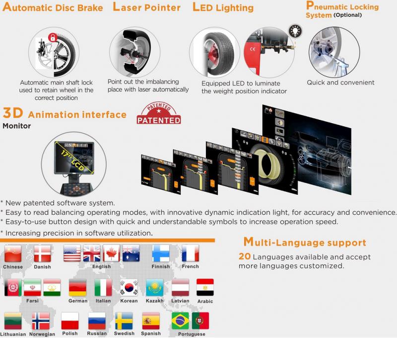 Автоматический ввод 3-х параметров: дистанции, диаметра и ширины диска. Остановка и фиксация колеса в месте установки груза. Лазерная указка места крепления груза. Возможность установки грузиков на 6 часов. LED подсветка внутренней поверхности диска. 9 программ балансировки (Normal, 8 программ ALU) Режим автокалибровки. Режим самодиагностики. Прочный вал Ø 40мм. Возможность изменения единиц ввода данных мм/дюймы. Максимальный вес колеса до 65кг. Мульти языковая поддержка – 20 языков ввода.