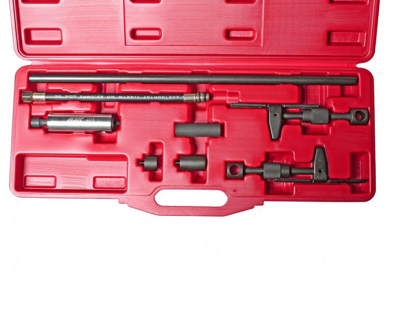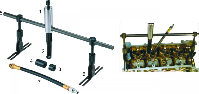 Рассухариватель Комплектация Рассухариватель состоит из: Опора (2 шт.); Вал; Опорный цилиндр; Толкатель; Удлинитель малый; Удлинитель большой; Адаптер для свечных отверстий. Описание Запатентованный. Представляет собой полный набор инструментов для установки и извлечения пружины клапана без необходимости снятия головки блока цилиндров двигателя. Возможность подачи в цилиндр сжатого воздуха (для предотвращения падения клапана в цилиндр). Особенности данной модели позволяют сэкономить время, рабочую силу, а также средства на покупку нескольких инструментов других брендов. Особенности патента Предоставляет возможность для работы одному специалисту. Для решения аналогичной задачи, инструмент других поставщиков требует участия двух мастеров. Позволяет работать под любым углом. Технические характеристики Толкатель: 22 мм. Применение Универсальный. Подходит для работы с 12, 16, 20, и 24-клапанными двигателями. СертификатJTC-1238 ПатентJTC-1238 СертификатJTC-1238