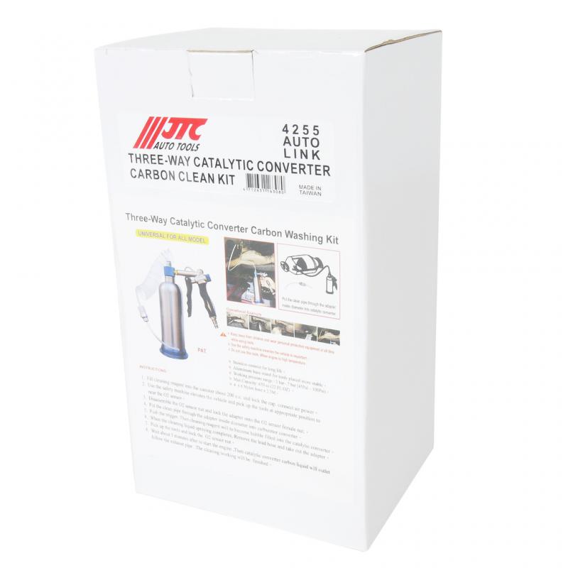 Комплектация Контейнер цилиндрической формы с рукояткой - 1 шт. Нейлоновая трубка (4х6 мм, длина 2.7 м) - 1 шт. Адаптер – 1 шт. Описание Предназначен для очистки катализатора от продуктов сгорания. Контейнер выполнен из нержавеющей стали. Алюминиевое основание делает конструкцию более устойчивой. Технические характеристики Диапазон рабочего давления: 3 бар-7 бар (45-100 Psi). Максимальный объем: 650 см³. Порядок работы Отсоедините датчик кислорода. Закрутите вместо датчика кислорода адаптер. Просуньте через отверстие адаптера нейлоновую трубку. Протолкните ее ближе к катализатору. Открутив верхнюю крышку на контейнере, залейте специальную очищающую жидкость. Рекомендуется использовать JTC-4255P (в комплект не входит). Закрутите крышку. Подключите компрессор к штуцеру, расположенному под рукояткой контейнера. Свободный конец нейлоновой трубки вставьте до упора в разъем, в верхней части контейнера. Выжимая спусковой крючок, начинайте процесс очистки катализатора. При необходимости используйте регулятор мощности. После завершения процедуры подождите 5 минут, затем заведите двигатель. Элементы использованной очищающей жидкости выйдут через выхлопную трубу. Важные рекомендации Не начинайте работу, если температура катализатора высокая. Дождитесь остывания катализатора. ПОДРОБНАЯ ВИДЕОИНСТРУКЦИЯ