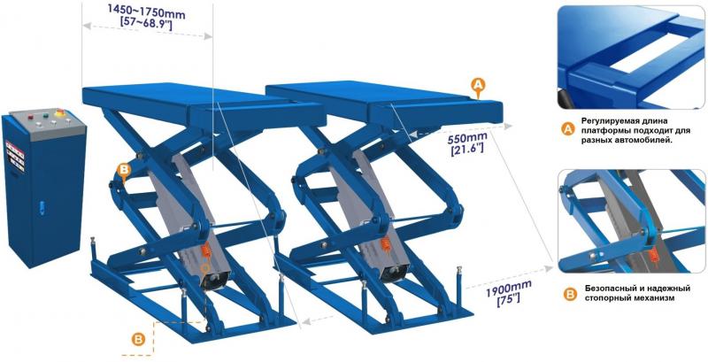 - Заездные трапы подъемника позволяют увеличить длину платформ с 1450 до 1750 мм.