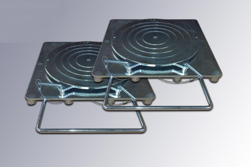 Комплект поворотных кругов (платформ) используется при выполнении работ на стендах сход-развал. Габариты платформы по основанию 370х375х50 мм. Нагрузка на поворотные круги 2000 кг.  На платформах отсутствуют шкалы и стрелки.