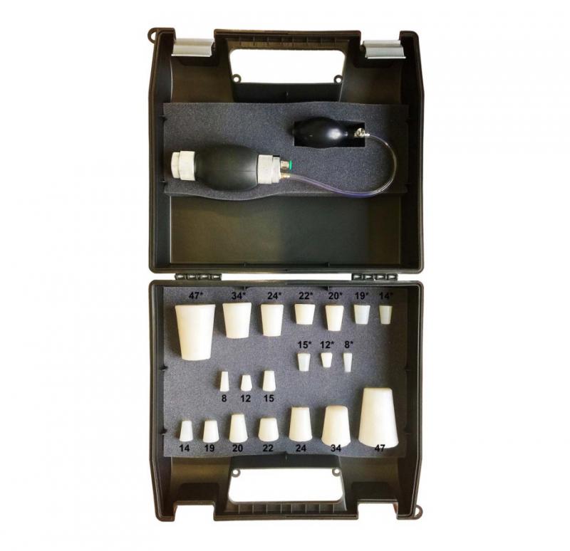 Входящий в комплект пневмоадаптер (регулируемая заглушка) с ручной помпой предназначен для герметизации отверстий и подачи потока дыма в тестируемый контур.