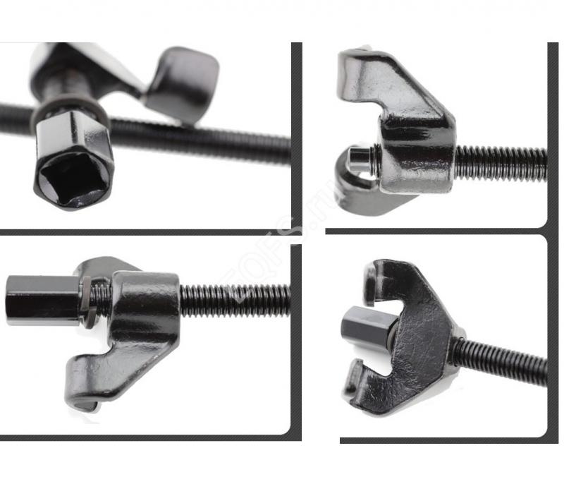 Винты с усиленной резьбой имеют шестигранный привод под ключ и квадрат под вороток 1/2’’. Подходит для использования в труднодоступных местах колесной ниши. Специальные раздвоенные концы предназначены для аккуратного захвата витков пружины. Максимальная длина захвата 380 мм.