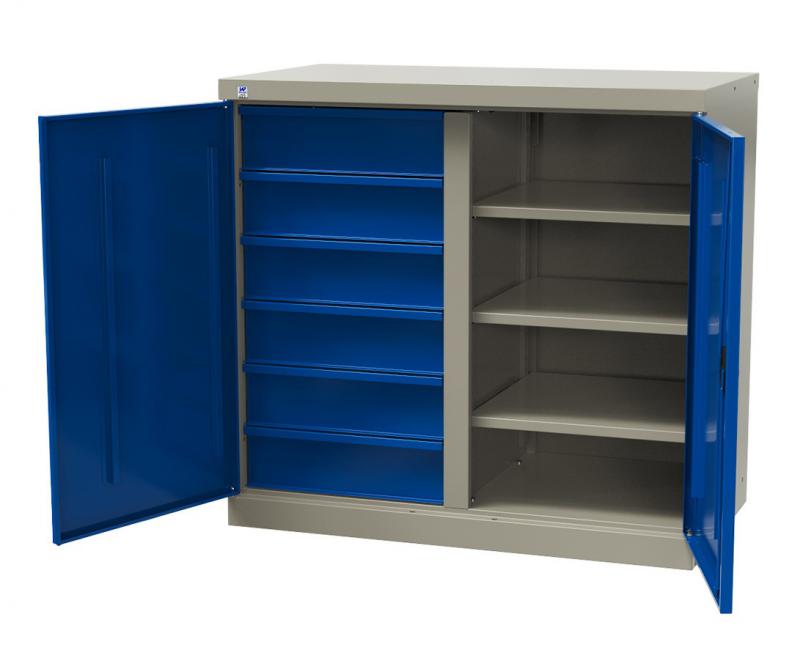 Конструкция инструментальных шкафов MLST позволяет индивидуально смоделировать шкаф, выбрав необходимые комплектующие и их расположение в шкафах. комплектуются индивидуальными замками-ручкой Cam-Lock, с ригельной системой запирания (2 ключа в комплекте); ригели диаметром 6 мм обеспечивают надежное запирание шкафа в двух точках; максимальная нагрузка на шкаф MLST6 – 350 кг; максимальная нагрузка на полки MLST (большие и маленькие) – 80 кг; максимальная нагрузка на выдвижные ящики MLST (большие и маленькие) – 30 кг; максимальная вместимость больших выдвижных ящиков MLST – 6 шт; максимальная вместимость малых выдвижных ящиков MLST – 12 шт. (с использованием вертикальной перегородки); максимальная вместимость перфорированных экранов MLST – 2 шт; шаг регулирования высоты полки – 25 мм; стандартный цвет: корпус – серый (RAL 7030), двери – синие (RAL 5017); тип покрытия: порошковое; сборно-разборная конструкция; поставляются в разобранном виде, в коробке из пятислойного гофрокартона.