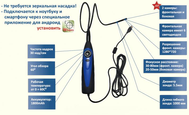 | ТХ (таблица) (Описание) : | Частота кадров в сек 30 Рабочая температура , ºС 0 +60 Угол обзора, град 60 Аккумулятор, mAh 1800 Кол-во камер, шт 2 Фокусное расстояние 30-80 Диаметр зонда, мм 5.5 Длинна гибкого зонда, мм 1000 |