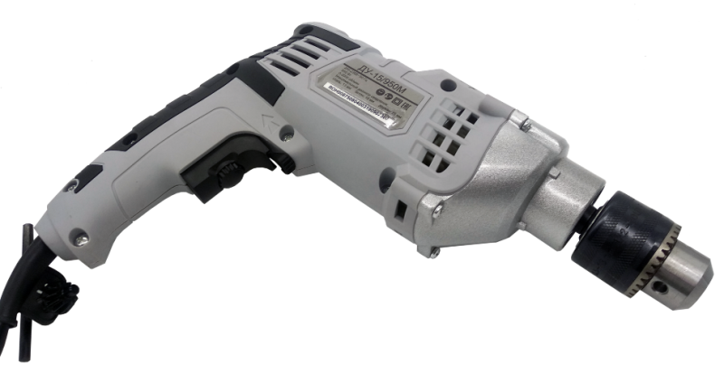 - Рукоятка имеет мягкую накладку и упор в нижней части для надежного захвата дрели во время работы.