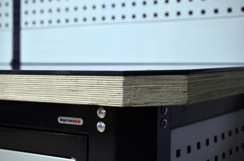 Нагрузка на столешницу 1500 кг. Столешница из листа влагостойкой фанеры марки ФСФ толщиной 40 мм. Рама верстака выполнена их холоднокатаной стали. Модуль верстака выполнен сварными. Ящики в модулях устанавливаются на шариковых телескопических направляющих полного выдвижения. Квадратная перфорация для установки крючков, держателей. В комплекте: столешница шириной 1493 мм, рама верстака, состоящей из опор, перемычек, боковых перфопанелей, малого модуля S3, большого модуля L6, двойного экрана с кронштейнами, комплекта освещения и блока коммуникаций. Размеры: 1982x1493x743 мм.