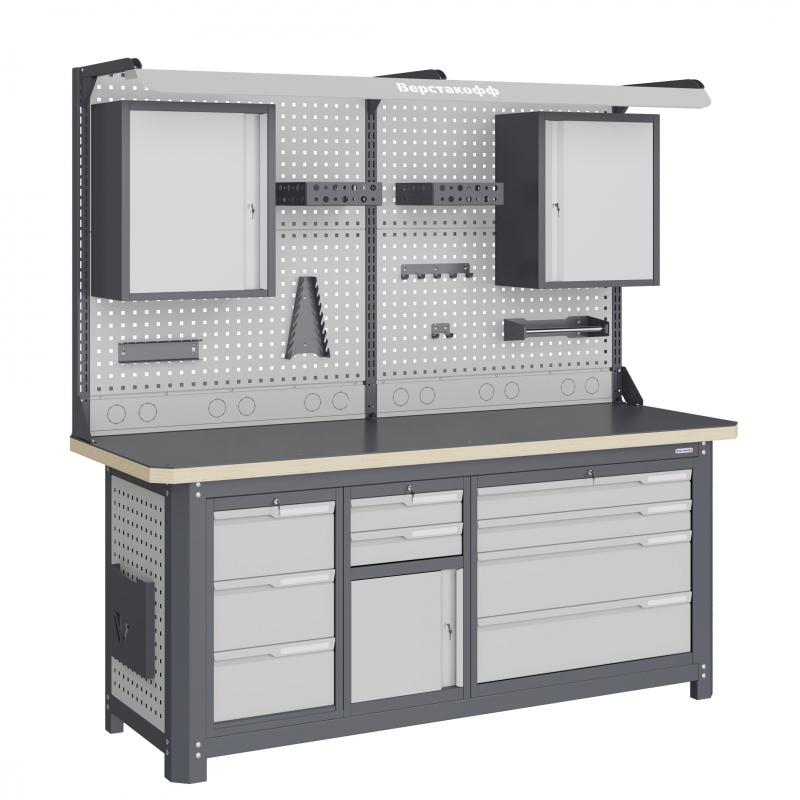 MECHANIC: MCN 2052.S39L4-2FR состоит из столешницы шириной 1993 мм, рамы верстака, состоящей из опор, перемычек, боковых перфопанелей, двух малых модуля S3 и S9, одного большого модуля L4, двойного экрана с кронштейнами, комплекта освещения и блока коммуникаций, двух навесных шкафов, двух лотков №1, одного держателя ключей, одного держателя отвёрток, одного держателя рулона, одной вешалки №1, одной вешалки №2, одного кармана для документации.