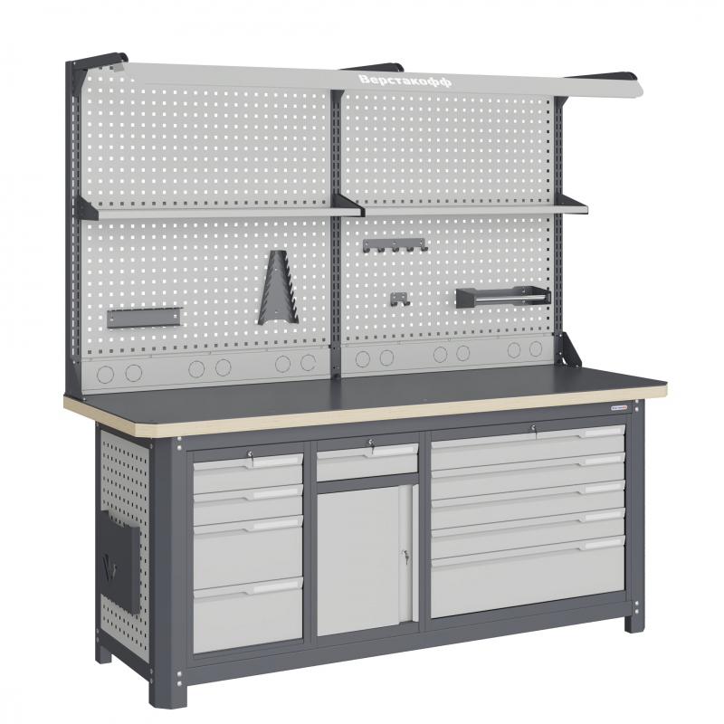 MECHANIC: MCN 2052.S48L5-2FR состоит из столешницы шириной 1993 мм, рамы верстака, состоящей из опор, перемычек, боковых перфопанелей, двух малых модулей S4 и S8, одного большого модуля L5, двойного экрана с кронштейнами, комплекта освещения и блока коммуникаций, двух навесных полок, одного держателя ключей, одного держателя отвёрток, одного держателя рулона, одной вешалки №1, одной вешалки №2, одного кармана для документации.