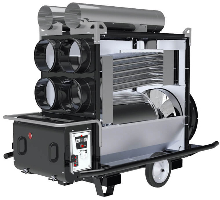 Тепловая пушка непрямого нагрева Master BV 471 S оснащена высокоэффективным осевым вентилятором, создающим давление в 250 Паскалей, что обеспечивает поток нагретого и очищенного воздуха, свободного от продуктов сгорания. Эти газы выводятся наружу через специальную систему отвода. Для равномерного распределения тепла в помещении предусмотрена возможность подключения от одного до четырёх гибких шлангов.